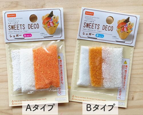 ダイソーにあったシュガー用の材料。粉砂糖(フェイクシュガー)の表現で使えるのか?と思ってやってみました。 ダイソーにあったスイーツデコのシュガー用材料。AタイプとBタイプがある。 Aタイプは木屑と塩化ビニル樹脂、Bタイプはガラスが材料となっていま…