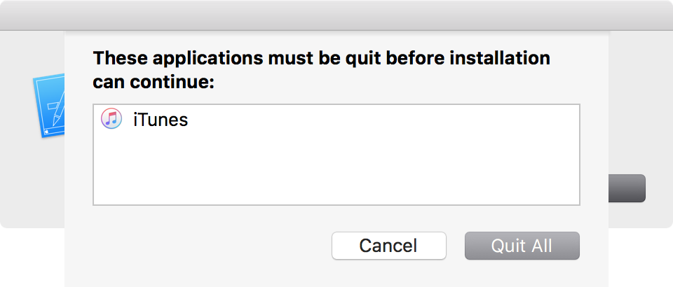 「Quit All」を選択するとリストの全てのアプリを自動で終了します。作業途中等で手動で終了させる場合は、「Cancel」を選択して、リストの全てのアプリを終了させてから、再度追加コンポーネントインストールを行います。